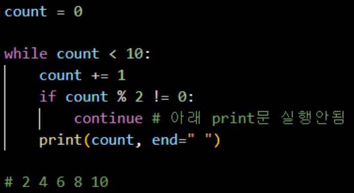 break는 말그대로 정지 continue는 이 조건은 그냥 넘어가 라는 뜻으로 간단하게 짝수 구별기로 확인하면