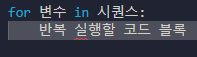 - for 문은 주어진 시퀀스의 요소를 순회하며 반복실행