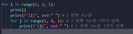for 문 안에 for문으로 if 문과 같이 먼저 가장 앞에있는 for문을 통과해 값을 받고 두번째 for문으러 들어가 두번째 for 문이 끝날때 까지 돌은후 다시 나오고 다시 들어가는 형식입니다.