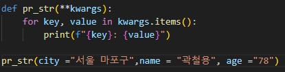 - 가변 키워드 매개변수로, 키워드 개수가 가변적일때 사용