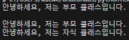 아 참고로 부모 클래스에 생성자가 없으면, 자식클래스에서도 별도의 생성자를 구현하지 않아도 부모 클래스의 속성과 메서드를 바로 사용가능합니다.