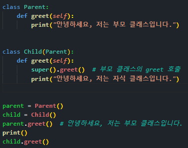- super().메서드명을 사용하여 자식 클래스에서 부모 클래스의 메서드를 호출 할 수있음