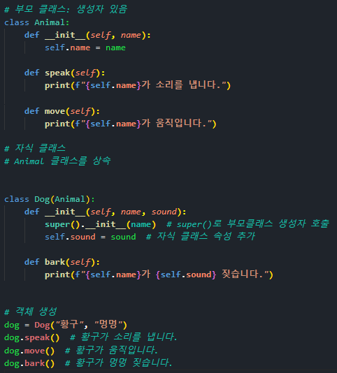자식클래스의 생성자 매개변수를 꼭 부모 클래스와 동일하게 안해도 되지만, 사용시에는 self.변수명으로 사용해주어야 합니다.