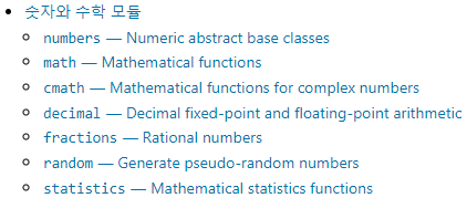 파이썬에서 기본으로 지원하는 모듈은 매우 많습니다. 자주 사용하는 모듈을 아래에 이미지로 공유해드리지만, 사이트에 직접 들어가서 모듈의 종류를 알아보는 것이 매우 좋습니다.