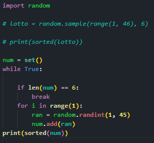 - 6개의 숫자 중 중복되는 숫자가 없도로 헤주세요.(set()을 쓰면 중복이 없어진데요 소근소근)