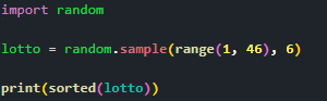 - 6개의 숫자 중 중복되는 숫자가 없도로 헤주세요.(set()을 쓰면 중복이 없어진데요 소근소근)