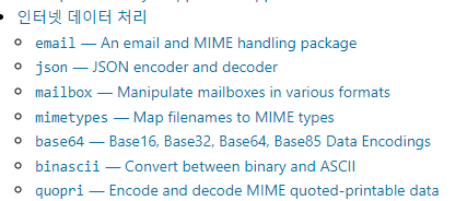 파이썬에서 기본으로 지원하는 모듈은 매우 많습니다. 자주 사용하는 모듈을 아래에 이미지로 공유해드리지만, 사이트에 직접 들어가서 모듈의 종류를 알아보는 것이 매우 좋습니다.