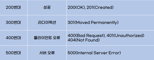- HTTP 상태코드 : 요청 성공 또는 실패를 나타냄.