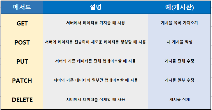 - HTTP 메서드 활용 : HTTP 메서드(GET, POST, PUT, DELETE 등)를 사용하여 리소스를 조작