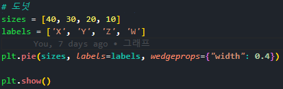 - wedgeprops : 각 섹션의 테두리 속성을 설정 (예:{'edgecolor' : 'black', 'linewidth' : 2})