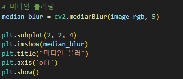 - 미디언 블러링 : medianBlur(이미지, k사이즈(홀수))