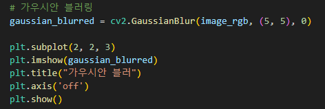 - 가우시안 블러링 : GaussianBlur(이미지, k사이즈(넚이, 높이)(홀수), x방향표준편차)