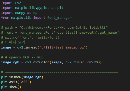- OpenCV는 기본적으로 이미지를 BGR 형식으로 다루며, Matplotlib는 RGB 형식을 사용. Matplotlib를 통해 OpenCV 이미지를 쉽게 변환하고 디스플레이 가능하다.