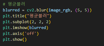 - 평균 블러링 : blur(이미지, k사이즈(넓이, 높이))