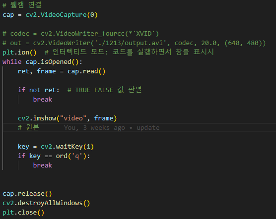 웹캠이 없으신 분들은 동영상 하나를 준비하셔서 약간 코드를 바꿔 주시면 됩니다.