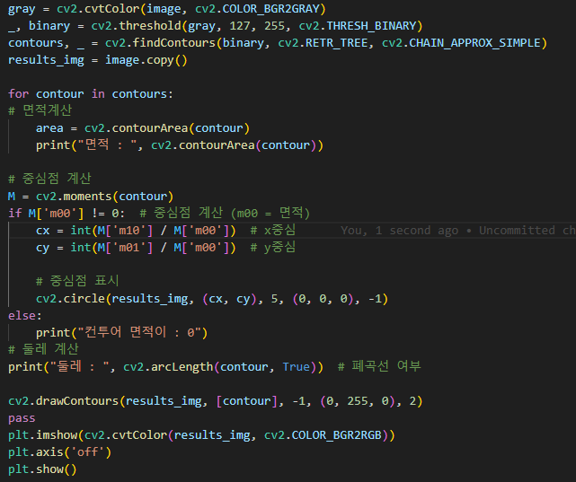 아까 저희가 컨투어 명령어중 면적, 둘레길이, 중심점을 계산할수 있다고 했으니 그것도 실습을 해봅시다!