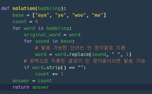 머쓱이는 태어난 지 6개월 된 조카를 돌보고 있습니다. 조카는 아직 "aya", "ye", "woo", "ma" 네 가지 발음을 최대 한 번씩 사용해 조합한(이어 붙인) 발음밖에 하지 못합니다. 문자열 배열 babbling이 매개변수로 주어질 때, 머쓱이의 조카가 발음할 수 있는 단어의 개수를 return하도록 solution 함수를 완성해주세요.