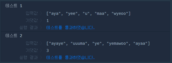 - babbling의 각 문자열에서 "aya", "ye", "woo", "ma"는 각각 최대 한 번씩만 등장합니다.