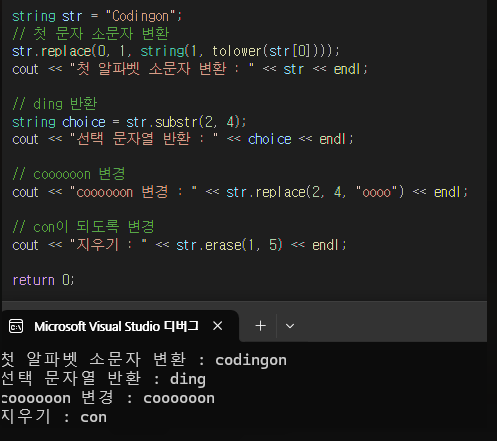 - 첫번째 문자 소문자로 변경 -> “codingon”
