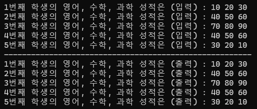 - 5명의 학생 점수를 수학, 영어, 과학으로 구분하여 관리