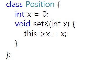 - setX에 매개변수 x가 class내에서 선언된 x와 같은 값이라고 선언해주는 코드