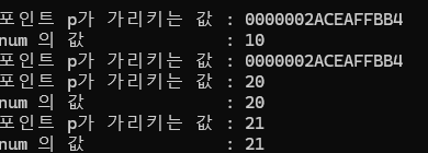 - 만약 num의 값을 20으로 다시 할당 한다면, pointer와 *pointer의 값은 어떻게 될지 확인해 보시오.