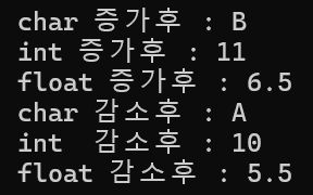 - 포인터를 이용해서 값을 1씩 더하거나 빼는 함수를 각 자료형 마다 하나씩 만들고 main함수에서 출력하시오.