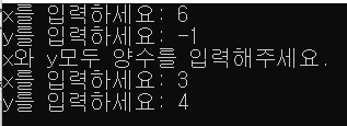 - 만약 사용자가 x 와 y에 0이나 음수를 입력한다면 에러 메세지를 출력 후 다시 입력 받기