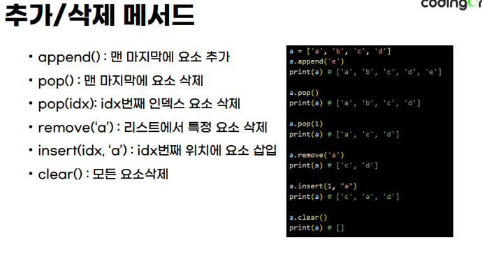 이 추가/삭제 매서드는 거의 모든 목록 자료형에서 쓰기 때문에 알아두시면 차후에 매우 편리합니다.